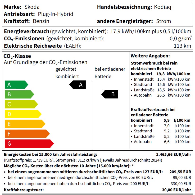 Energieverbrauch gewichtet kombiniert: 19,8 kWh/100km plus 0,5 l/100km | Kraftstoffverbrauch bei entladener Batterie kombiniert: 5,9 l/100km | CO₂-Emissionen gewichtet kombiniert: 0 g/km | CO₂-Klasse gewichtet kombiniert: A* | CO₂-Klasse bei entladener Batterie: B*